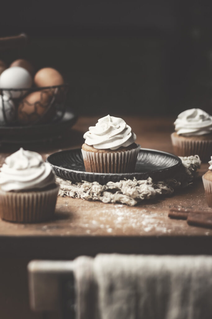 These snickerdoodle cupcakes have a vanilla cake base with the addition of cinnamon, sugar and sour cream. Then I top these cupcakes with refreshing and fluffy whipped cream frosting and sprinkle a spoonful of cinnamon sugar mixture on top. You can whip the cream with cinnamon and sugar mixture for a look of nostalgic snickerdoodle. The frosting is versatile, so go with you’d like to top them off!